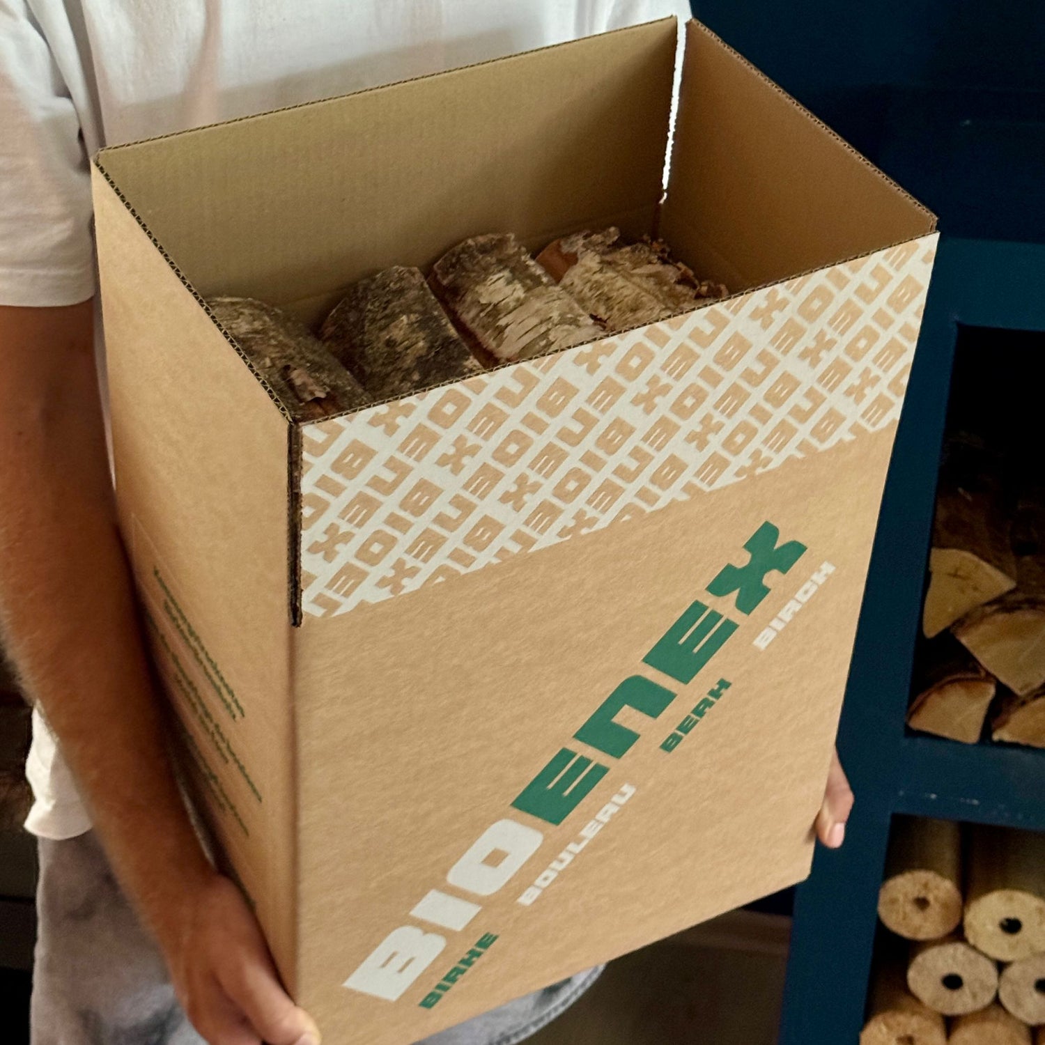 Vos bûches séchées au four vous seront livrées dans un emballage durable, empilable et sans plastique. Chaque boîte a un volume de 44 litres. Cet emballage réutilisable peut être utilisé en toute sécurité comme amadou pour allumer votre feu à la fin de son cycle de vie