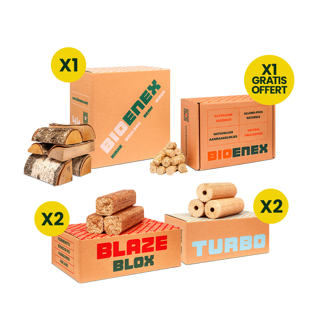 Koop je de producten los – twee dozen Turbo Hardhoutbriketten, twee dozen BlazeBlox Vuurbriketten, één doos ovengedroogd berkenhout en één doos Natuurlijke Aanmaakblokjes – dan betaal je in totaal 177,70 €. Met deze bundel bespaar je 29,95 €.